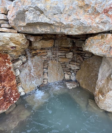 A stone-formed grotto creates a cool, acoustic retreat. Subtle light washes animate the rock texture and falling water.
