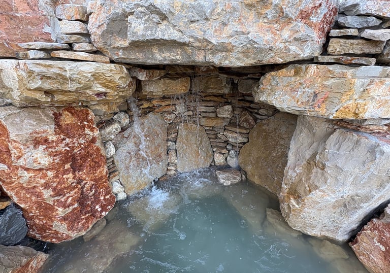 To complement the wetland, the water is refined by two commercial-grade UV sterilizers and a BioBead filtration system for robust, low-maintenance clarity. Surface water is quietly drawn over a natural stone infinity edge into a dedicated stone intake bay, completing circulation with efficient skimming and debris capture.